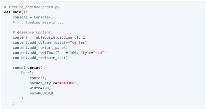 The result is a lightweight, installable package. The core logic resides in funsize_engineer/card.py, which orchestrates the rich components.