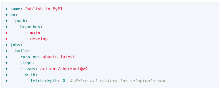 This artifact allowed the developer to verify that the workflow was correctly targeting both branches and, crucially, that fetch-depth: 0 was included to ensure setuptools-scm could correctly calculate versions from git tags.