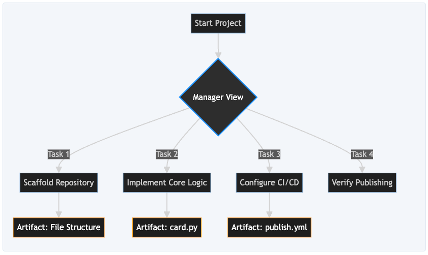The project began with a high-level directive. The agent analyzed the requirements—a Python package, rich library for UI, and PyPI distribution—and generated an implementation plan. It then scaffolded the directory structure, creating pyproject.toml for modern standards-compliant packaging and setting up the initial git repository.